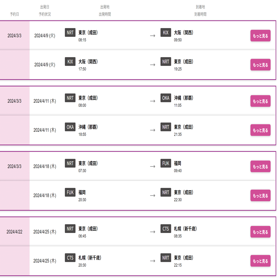 2024年4月に「東京/成田発」で「大阪/関西(8時間・7,200円)」「札幌/千歳(11時間55分・7,500円)」「福岡(10時間50分・9,400円)」「沖縄/那覇(7時間50分・10,500円)」の4路線の搭乗を例に、成田からLCCの乗り方を解説してみます。