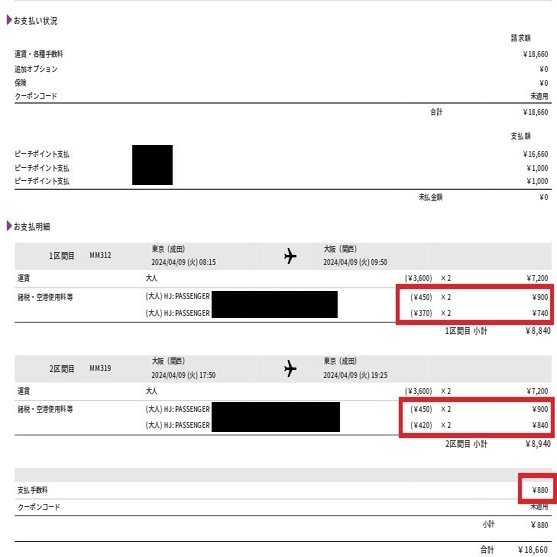 LCCの見かけ上の往復運賃に、支払手数料、空港施設使用料を入れると最初の安い印象が少し薄れますね。