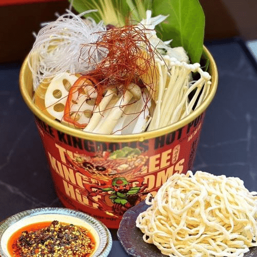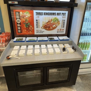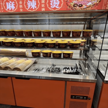 麻辣スープに40種類以上のお好みトッピング(麺・野菜・肉・魚)を好きなだけ入れられます。容器は大:1000円(税込)、小700円(税込)、辛さは調整可能。